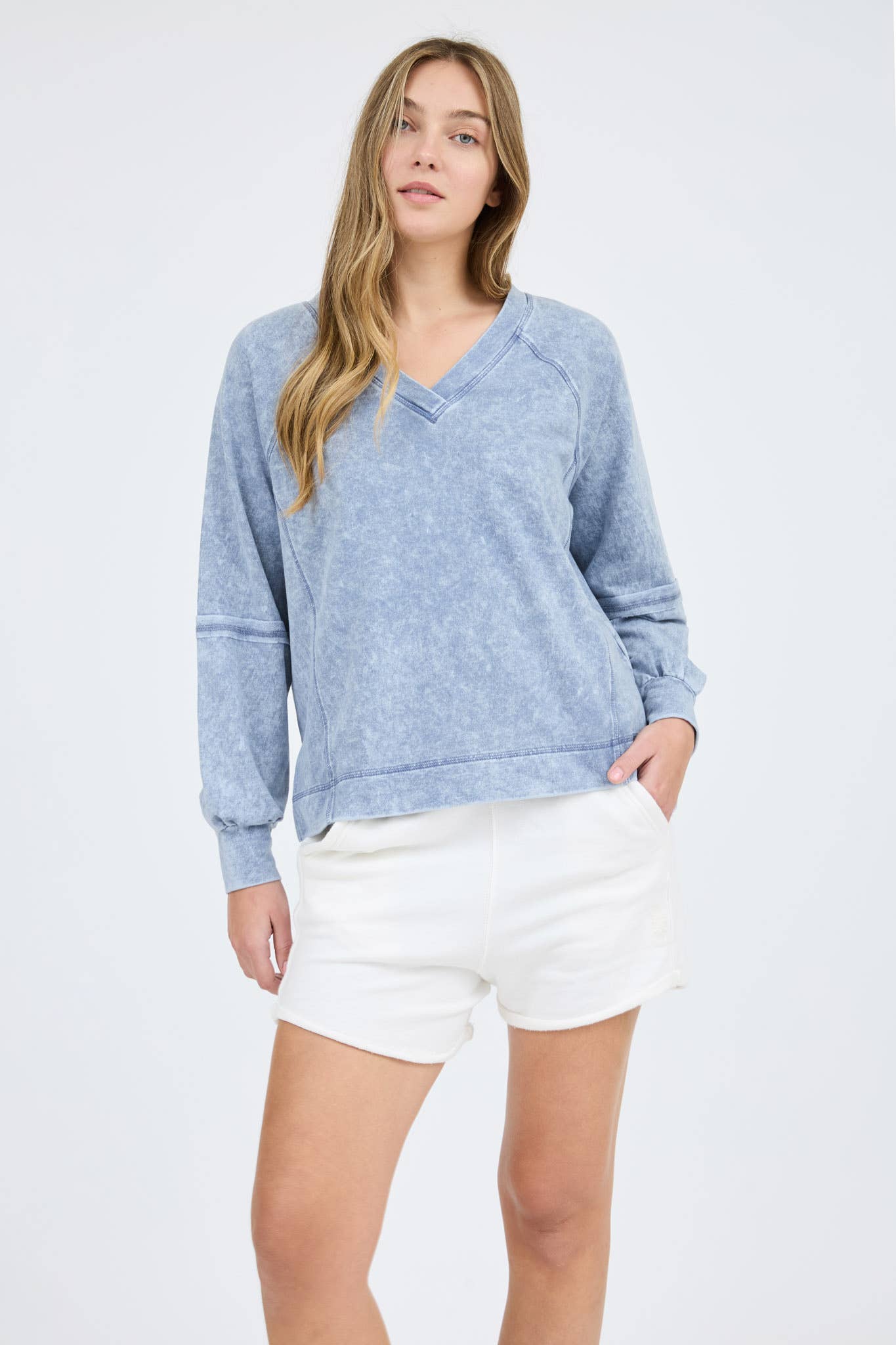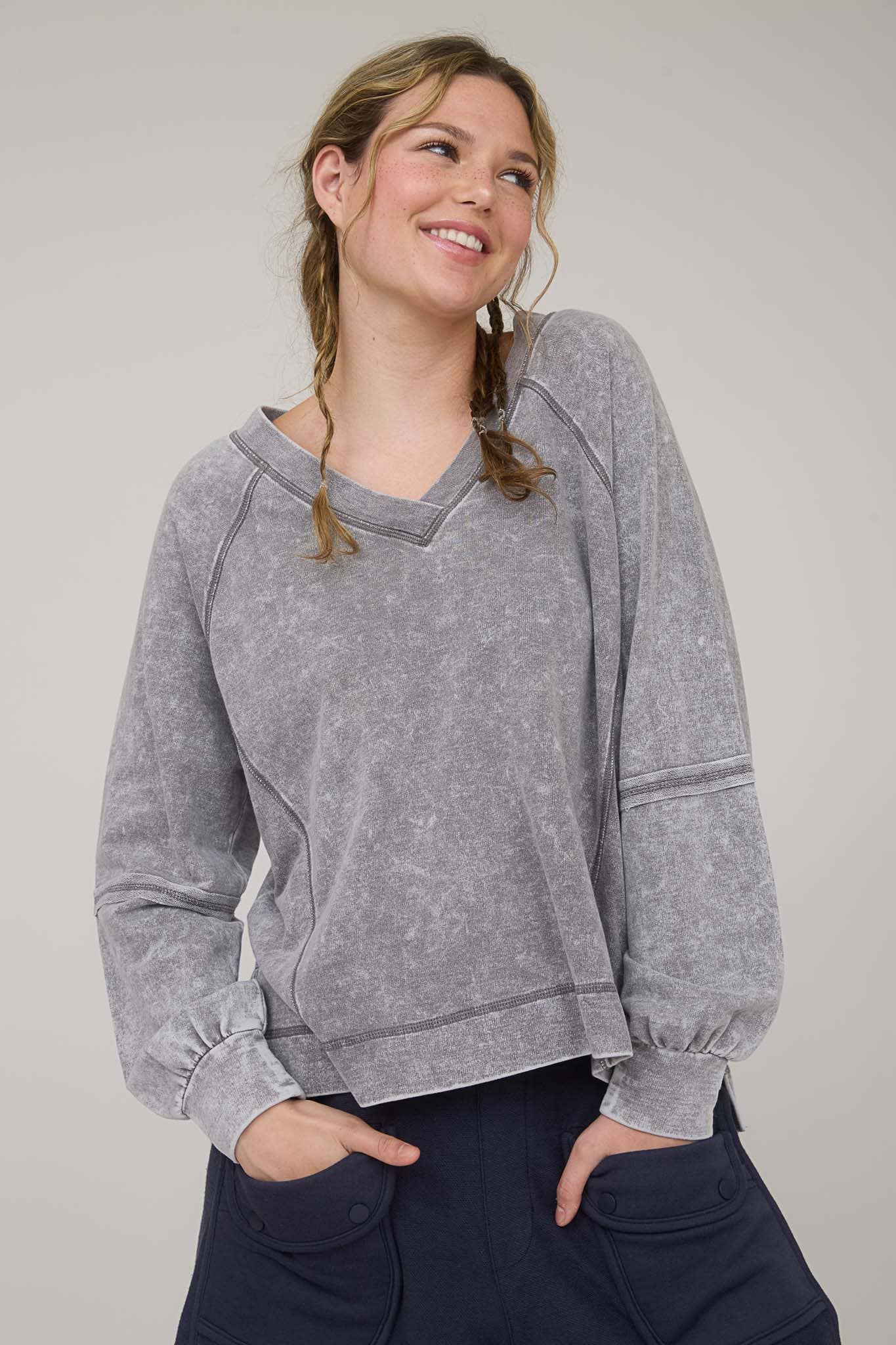 V-Neck long sleeve knit top. Design to be worn on or off the shoulder featuring exposed seams.